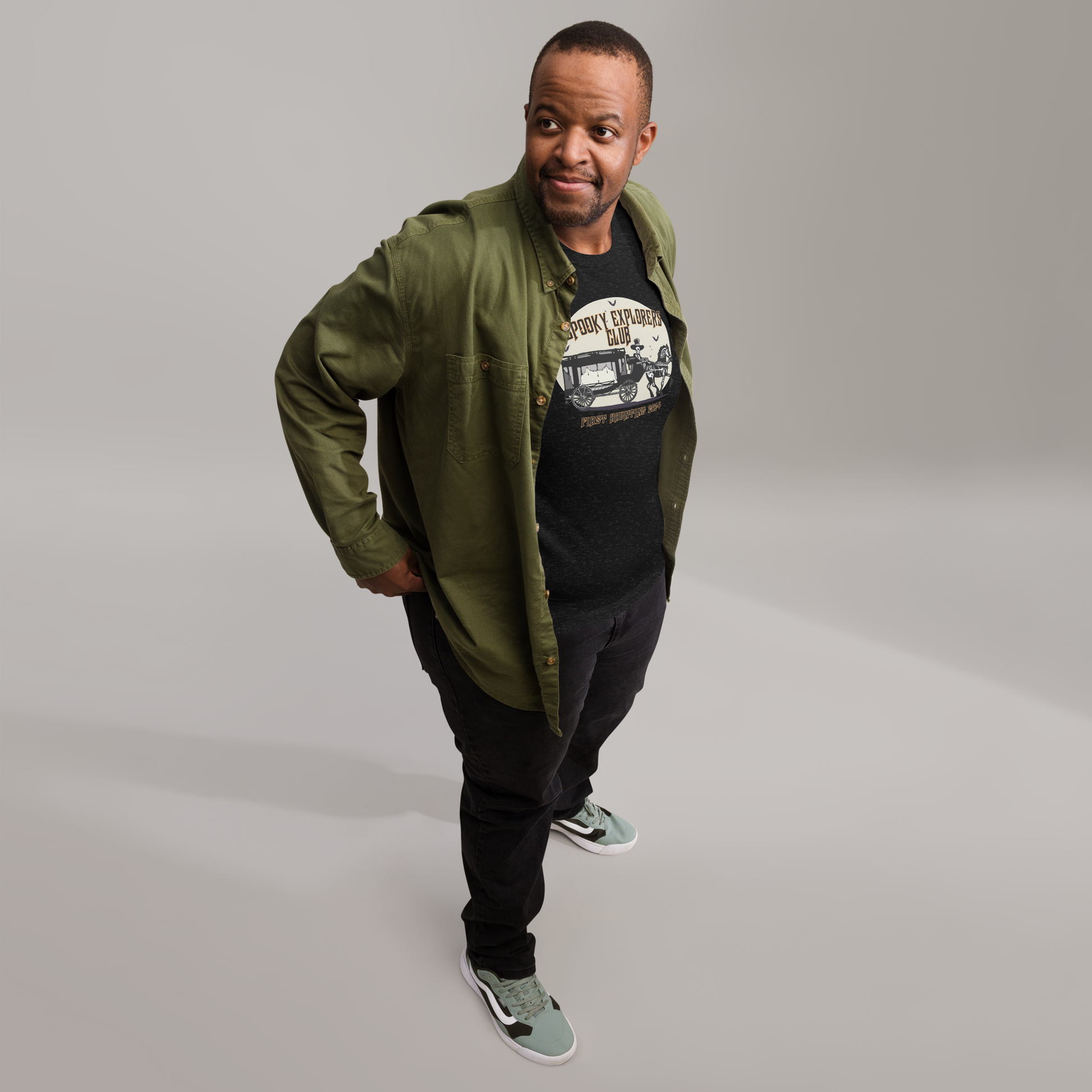 Foolish mortals unite and show your pride in being a member of the Spooky Explorers Club, the not-so-scary paranormal and adventure company — launched by Aaron Sagers — with this 2024 "First Haunting" sweatshirt.