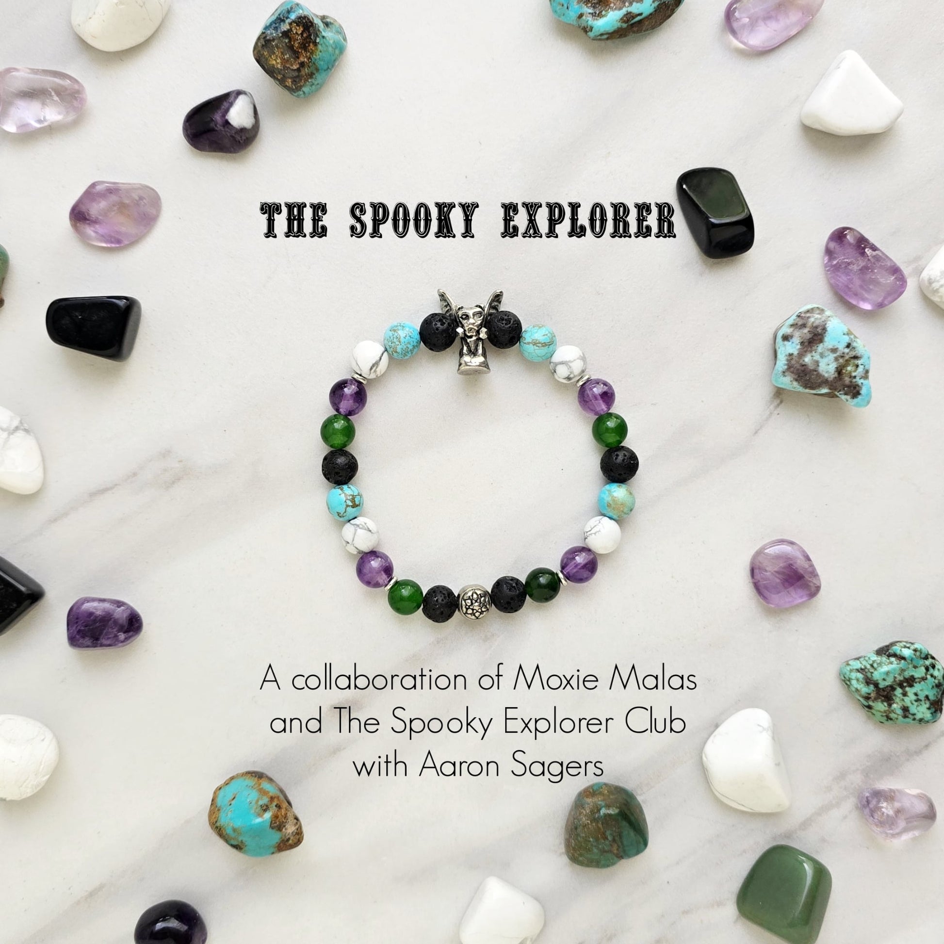 Ghost host Aaron Sagers’ newest bracelet was designed in collaboration with Moxie Malas as a charm for those who dare to wander into the shadows — guided by curiosity, whimsy, and a hint of mischief. Inspired by the ghostly grandeur of haunted mansions and swinging wakes, it celebrates the magic of exploration of both creepy old crypts — and hidden corners of the world. Each stone is chosen to channel sympathetic vibrations and balance courage with calm, mystery with protection, and a little spectral luck for the road ahead. Wear it as a talisman of curiosity, intuition, and delight in the supernatural. After all, true explorers know that every journey has its happy haunts.